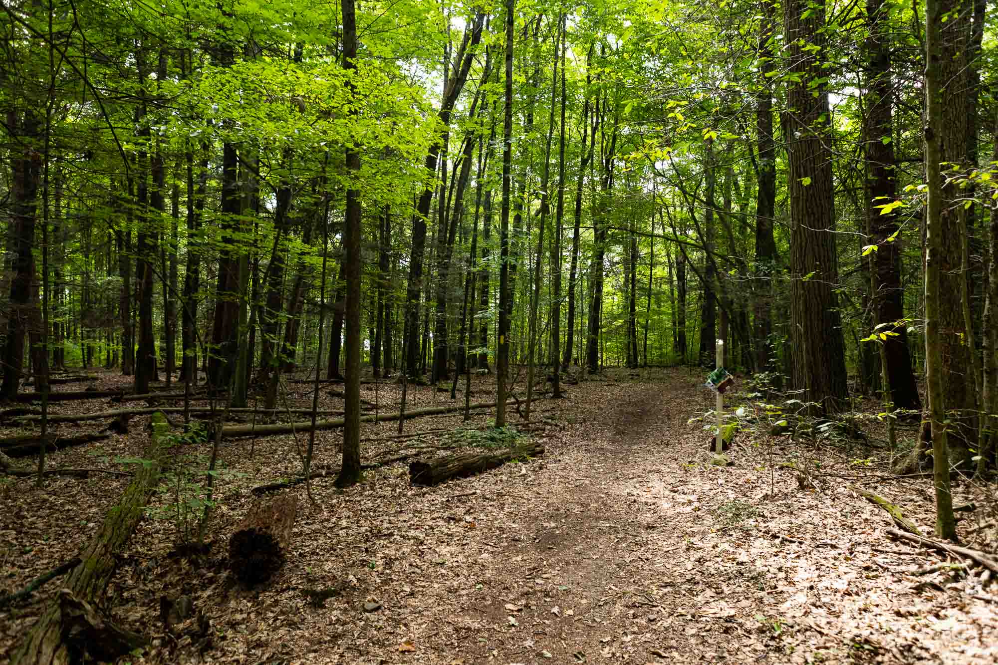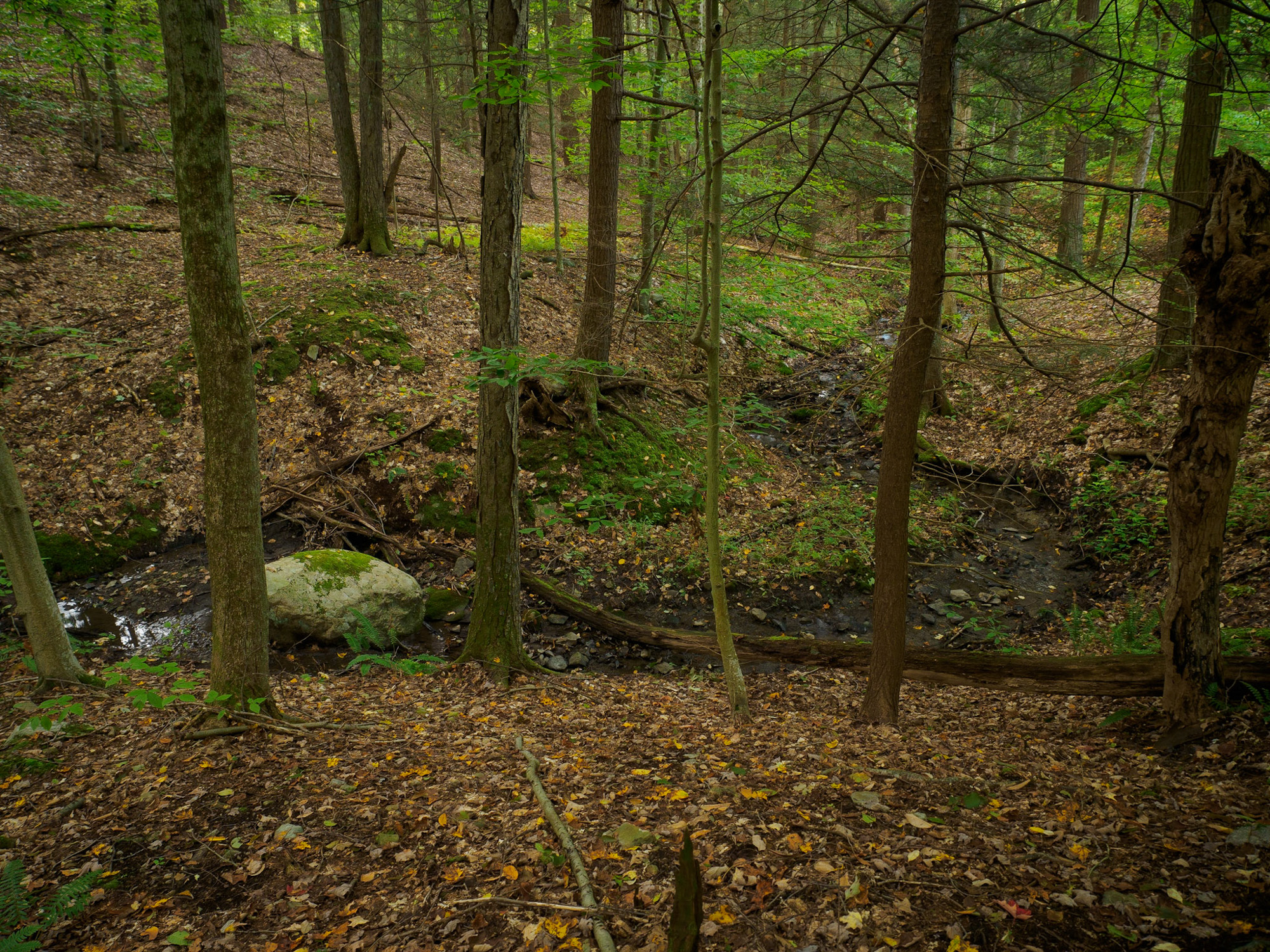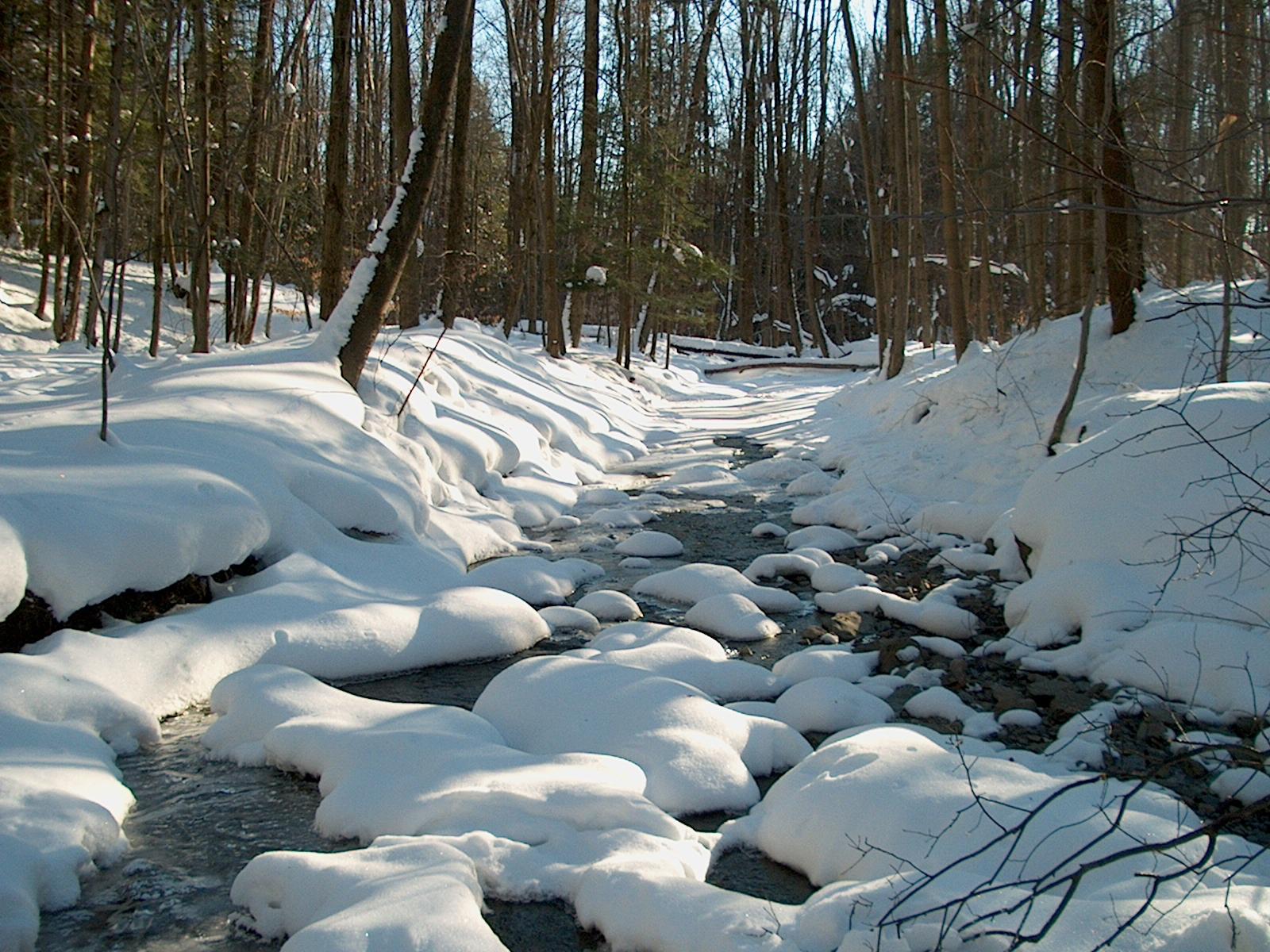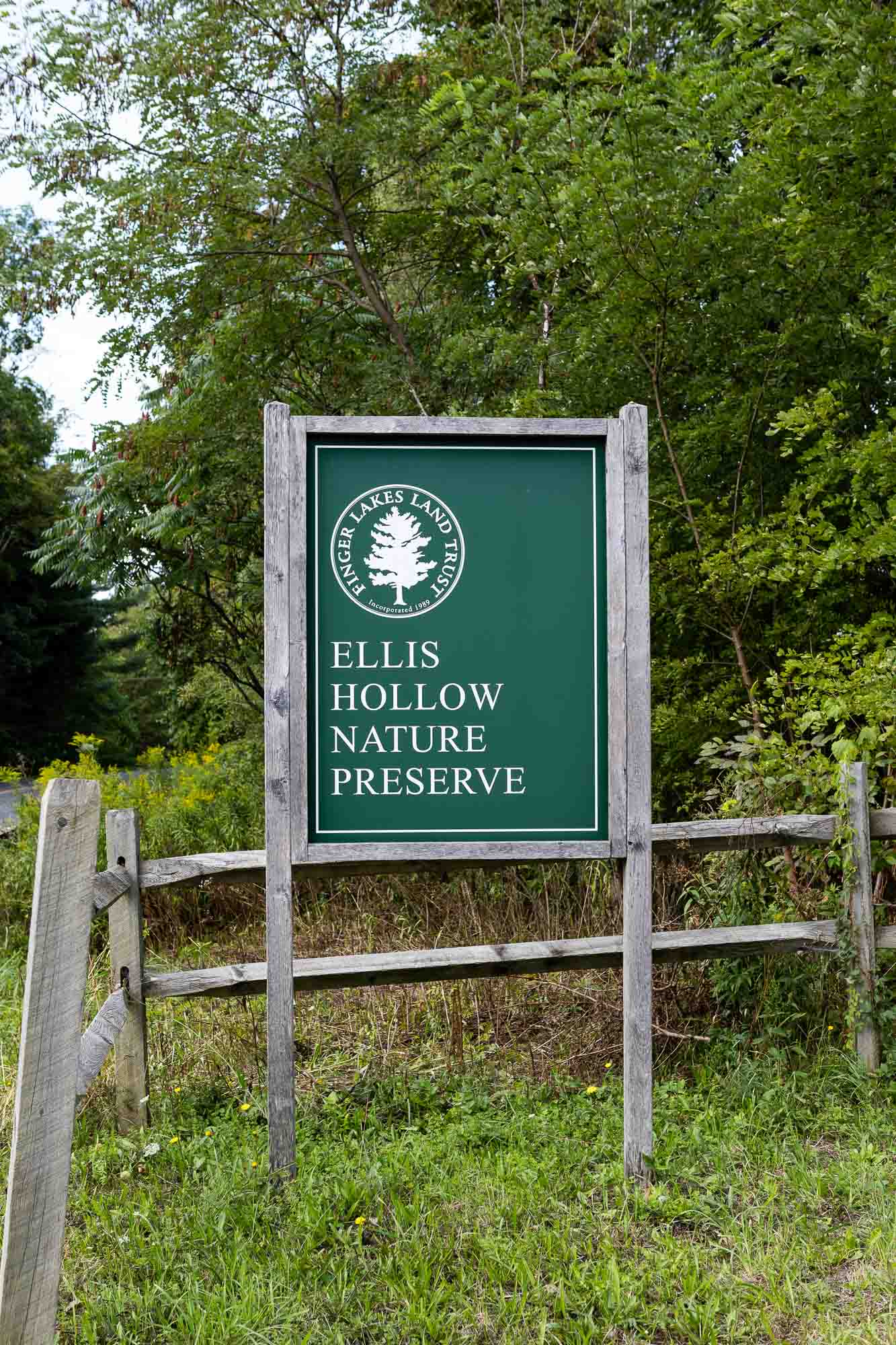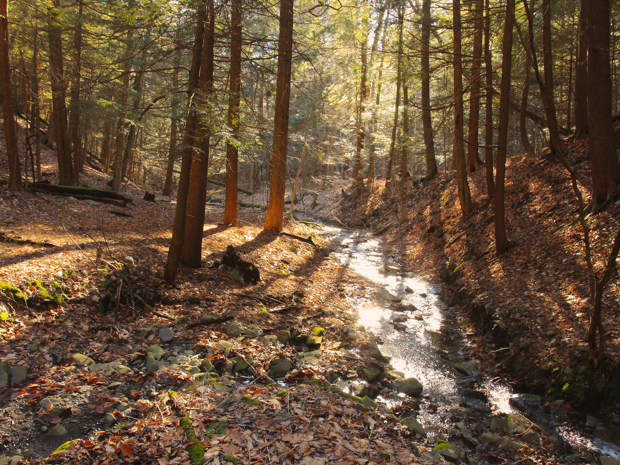 Need a break from the hassles of everyday life? A walk through the fern-carpeted forests of the Ellis Hollow Nature Preserve, owned by the Finger Lakes Land Trust, could be just the thing. In winter, take your cross-country skis to enjoy one of the peaceful, snow-covered loop trails. Just a short drive from downtown Ithaca, this 150-acre preserve on the northern hillside of the Ellis Hollow valley has 2 miles of hiking trails. The parking area and initial stretch of trail gives no hint of what’s to come. After 500 feet you will find an informational kiosk which marks the junction where the trail splits into a series of nested loops. Starting to the left will take you along a stream and through a forest where shady eastern hemlock often dominates. The path on the right winds up and around a somewhat terraced hillside through a mixed hardwood forest. In the spring and summer, the preserve’s quiet, steepsided glens provide visitors with spectacular birding opportunities. The streams running through the preserve drain into Cascadilla Creek, and are important for maintaining the water quality in the creek and nearby wetlands.