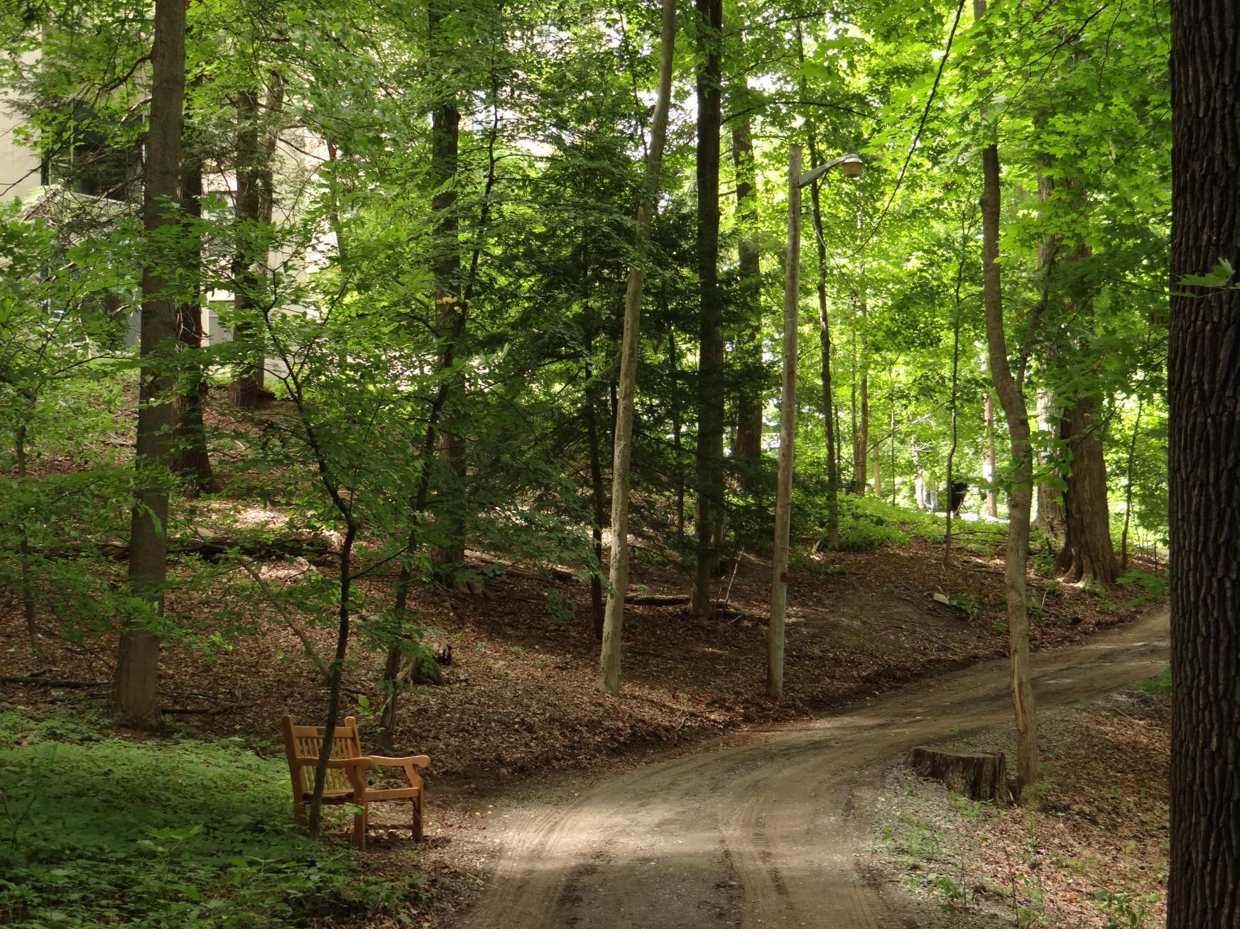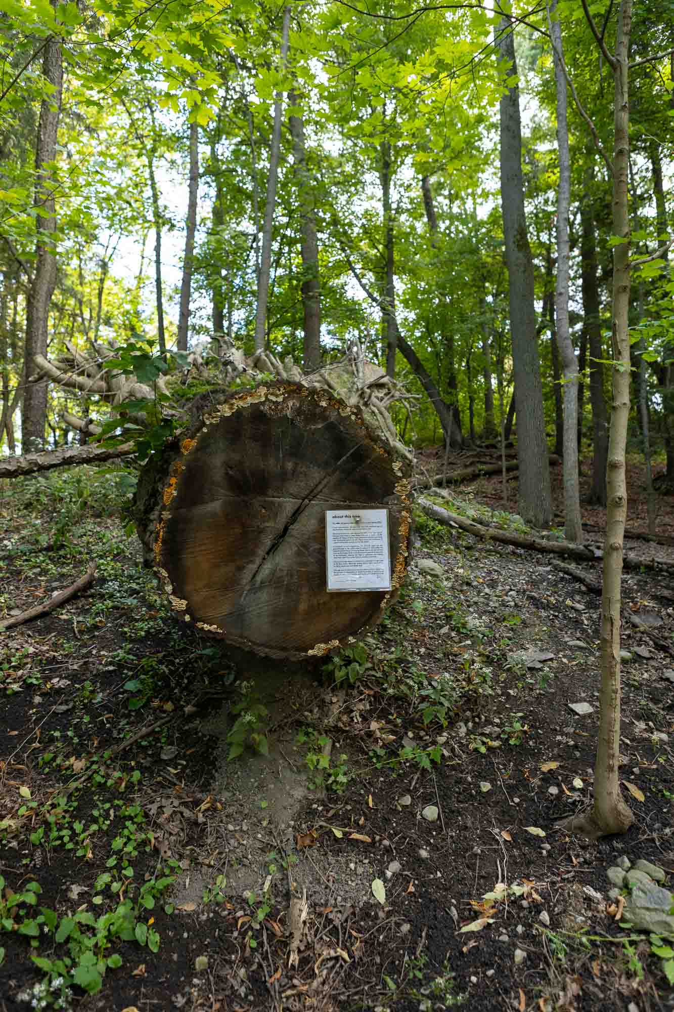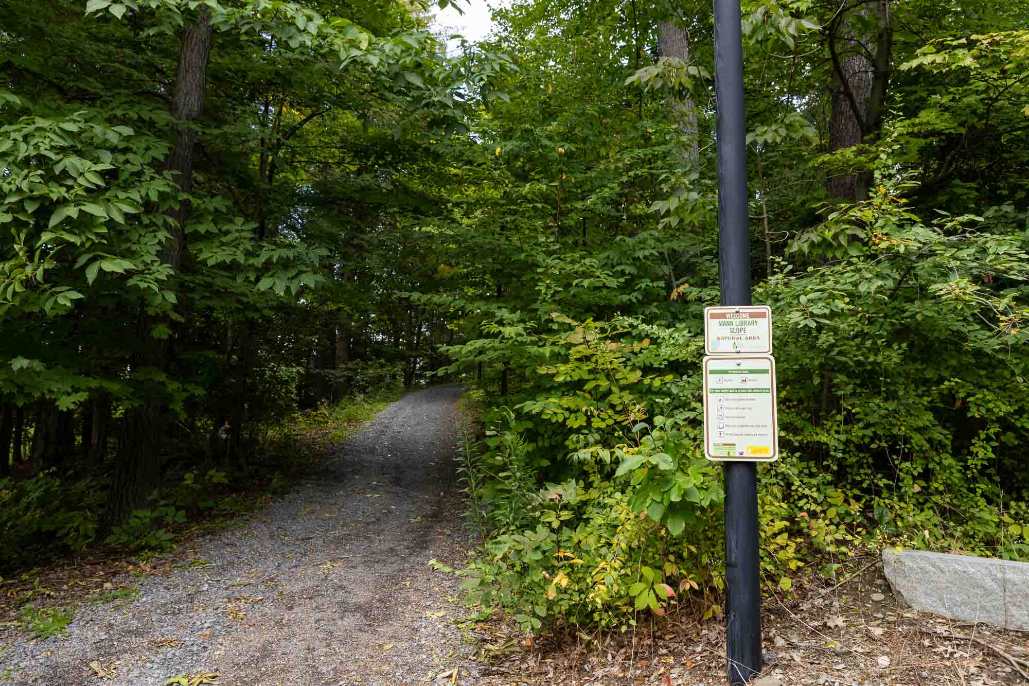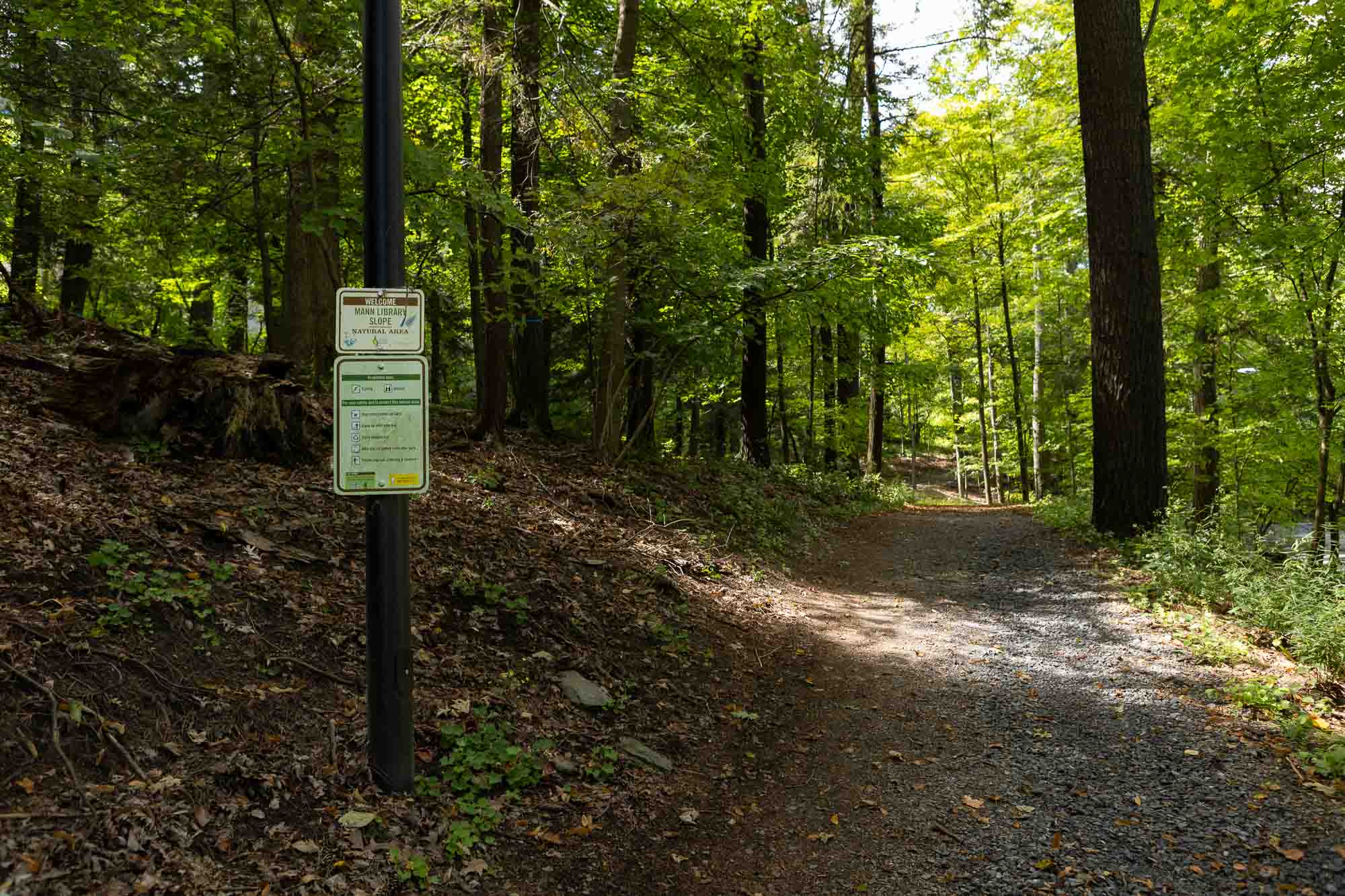 Trails within Cornell Botanic Gardens Mann Library Slope Natural Area connect Cornell’s Ag Quad to the Cayuga Trail, Beebe Lake Natural Area and Botanic Garden area around the Nevin Welcome Center. The preserve here includes very large, old trees including sugar maple, beech, hemlock and basswood. Trees of mixed ages typically coexist in very old forests such as this one.