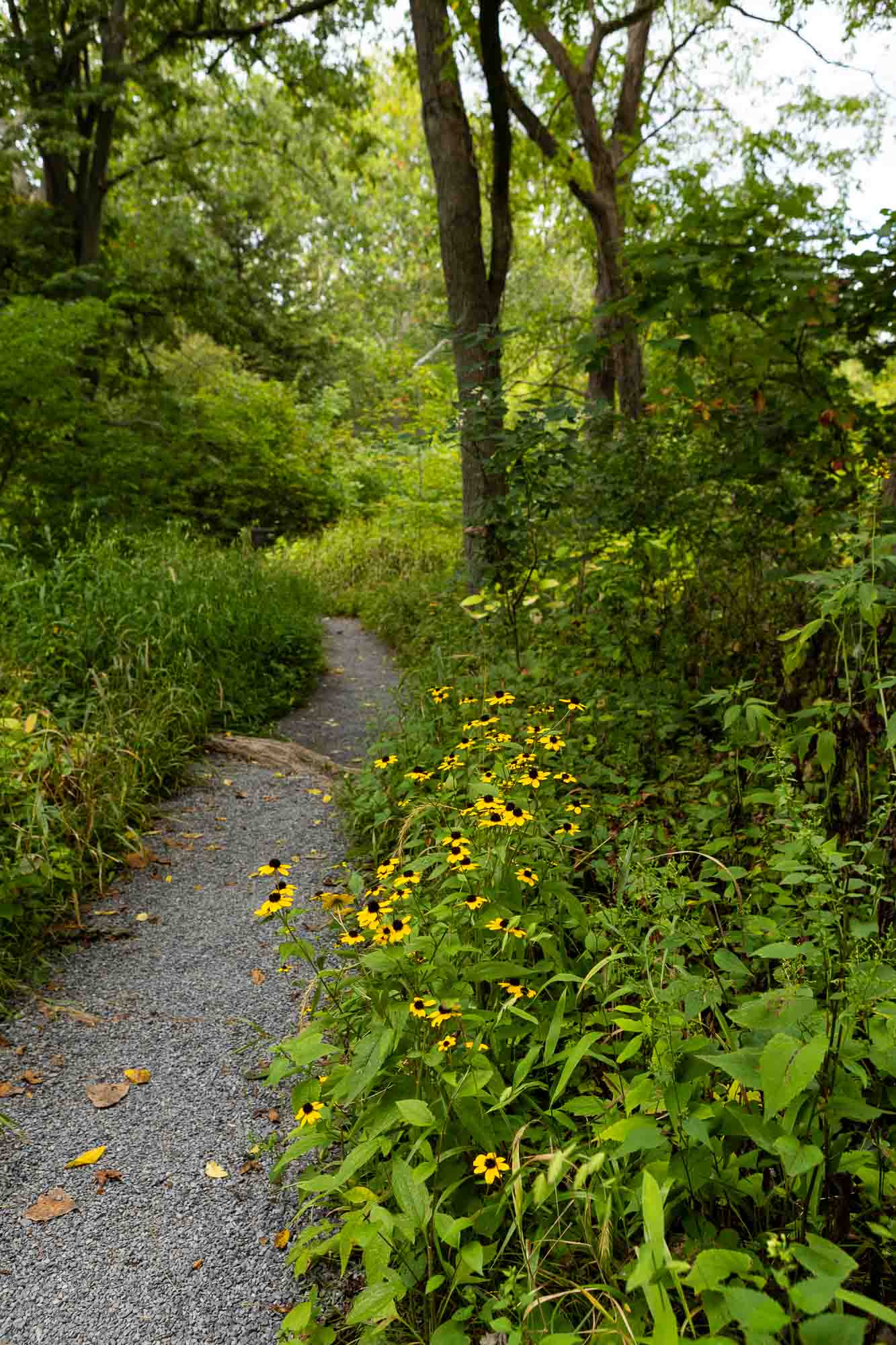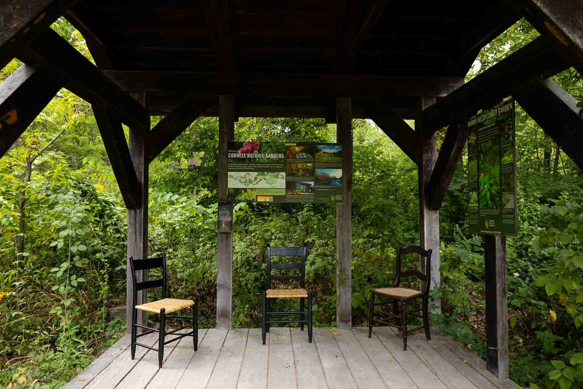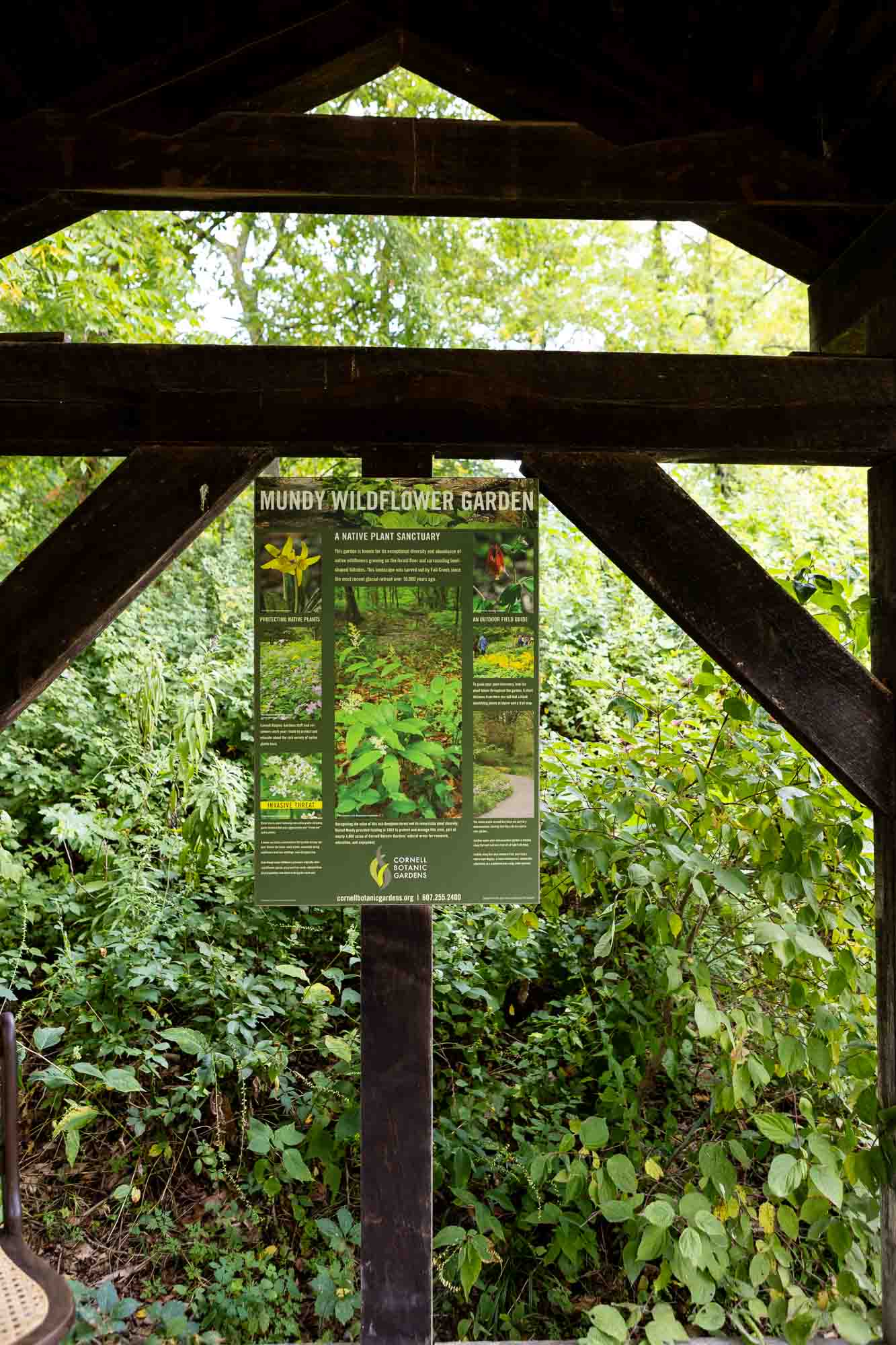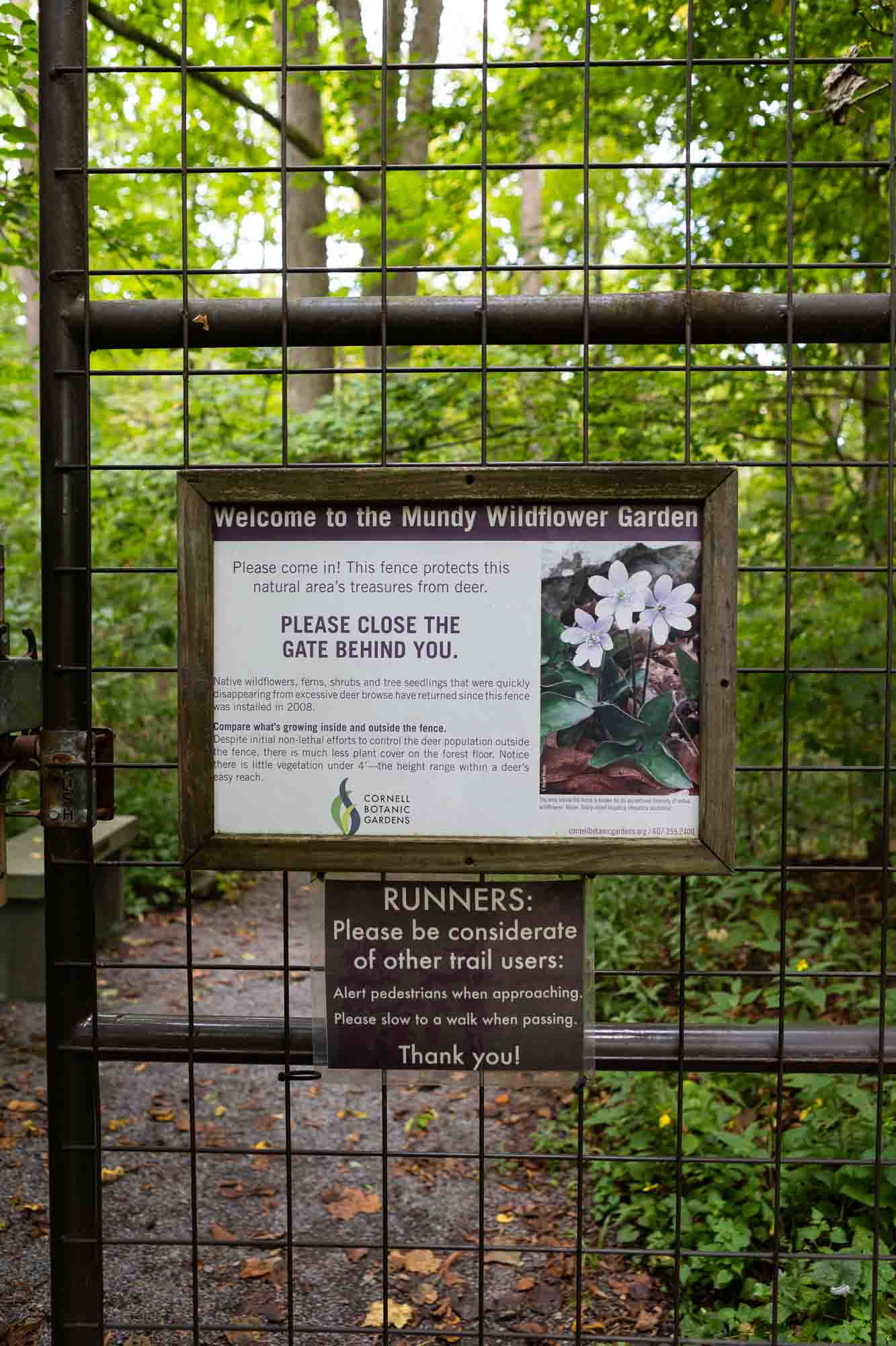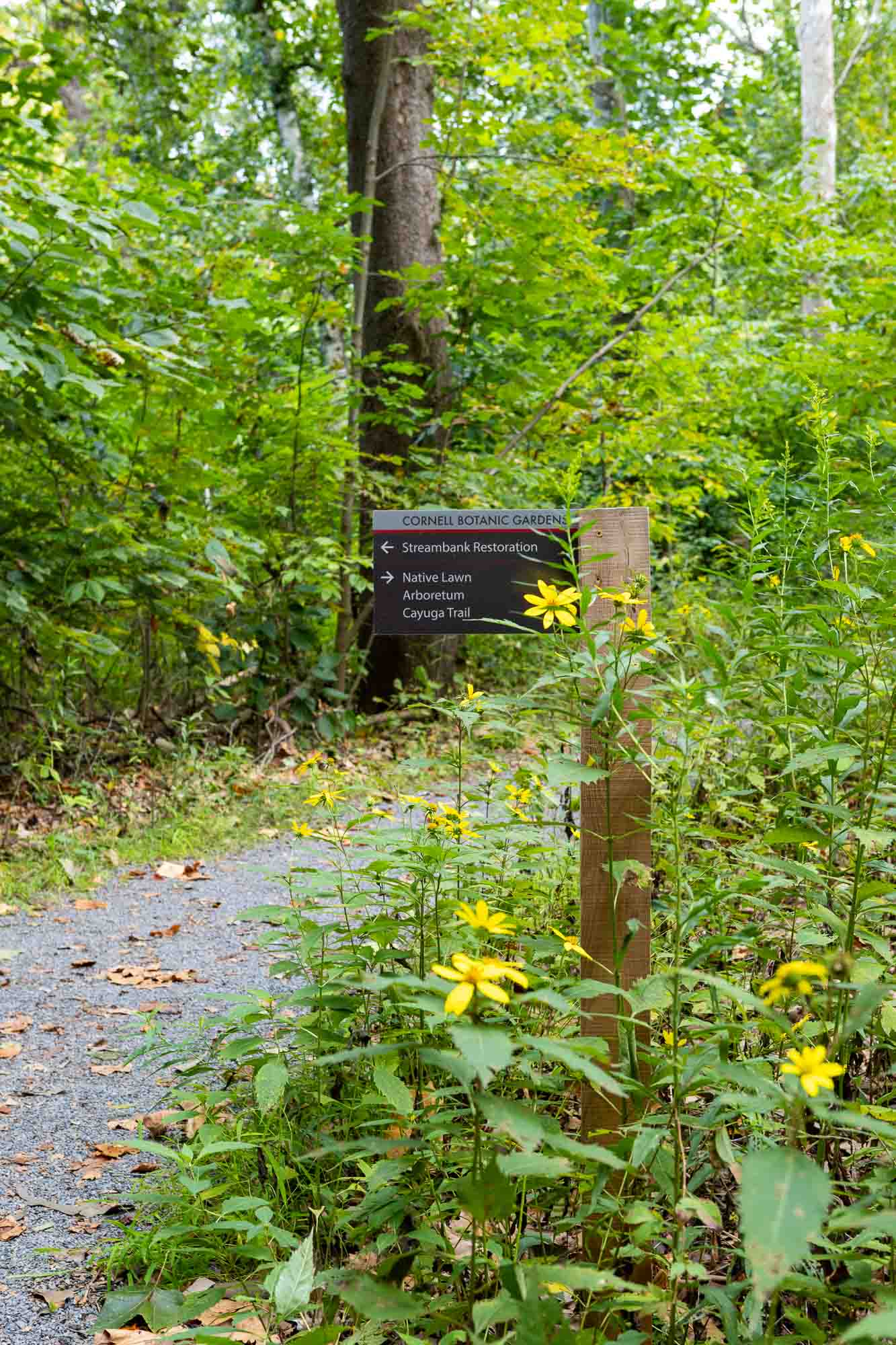 Along the trails within the Cornell Botanic Gardens Mundy Wildflower Garden you will find a remarkable variety of plants native to the Cayuga Lake Basin. The preserve contains forested slopes, floodplain forests, wetland meadows, and displays of native plant landscaping, all bordering a scenic section of Fall Creek. To guide your plant discovery, you will find labels next to over 200 native plant species as well as photographs and lists of the season’s flowering plants at a display near the entrance. Trails here connect with the Cayuga Trail, the Botanic Garden area around the Nevin Welcome Center, the F. R. Newman Arboretum, and additional, adjoining natural areas.