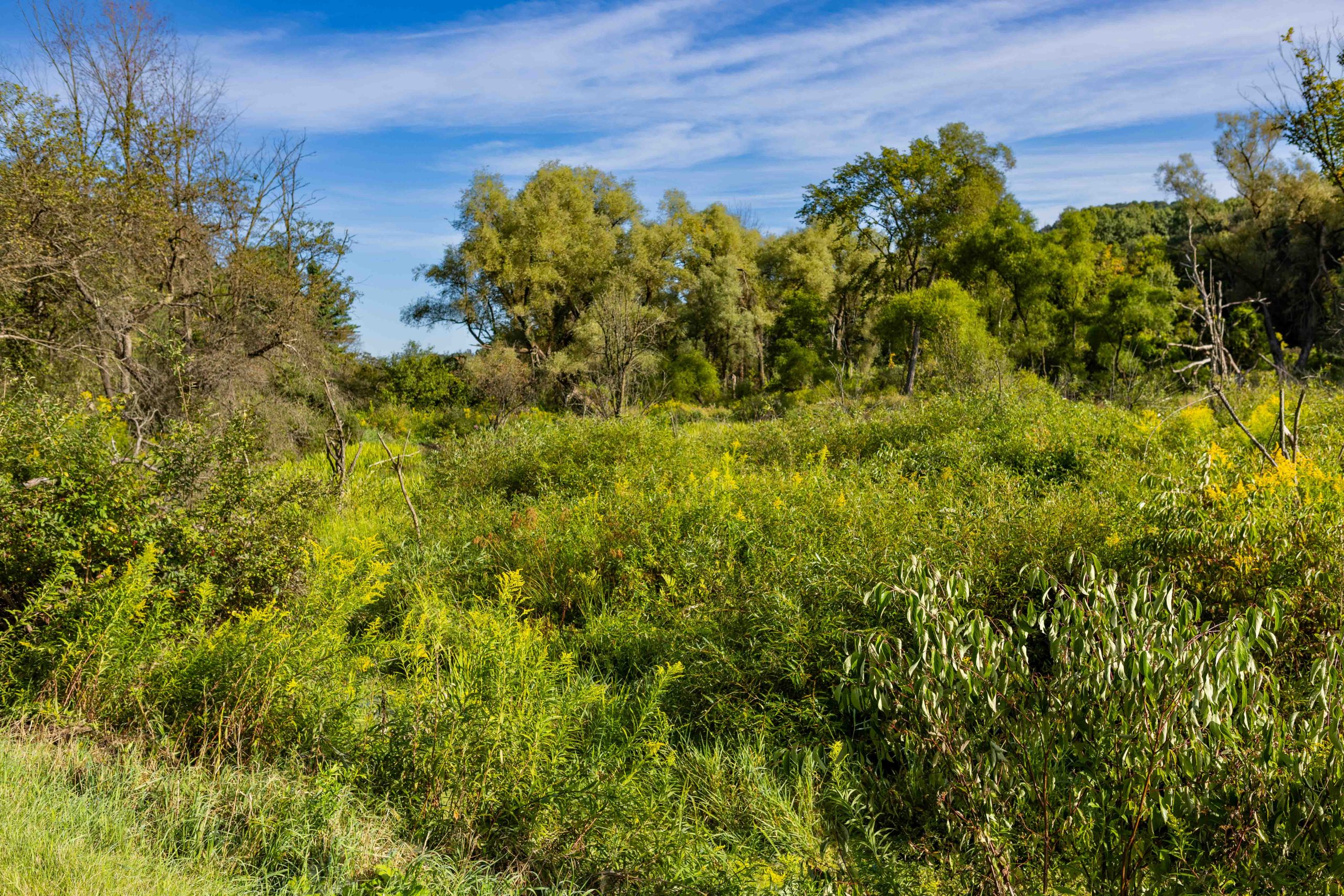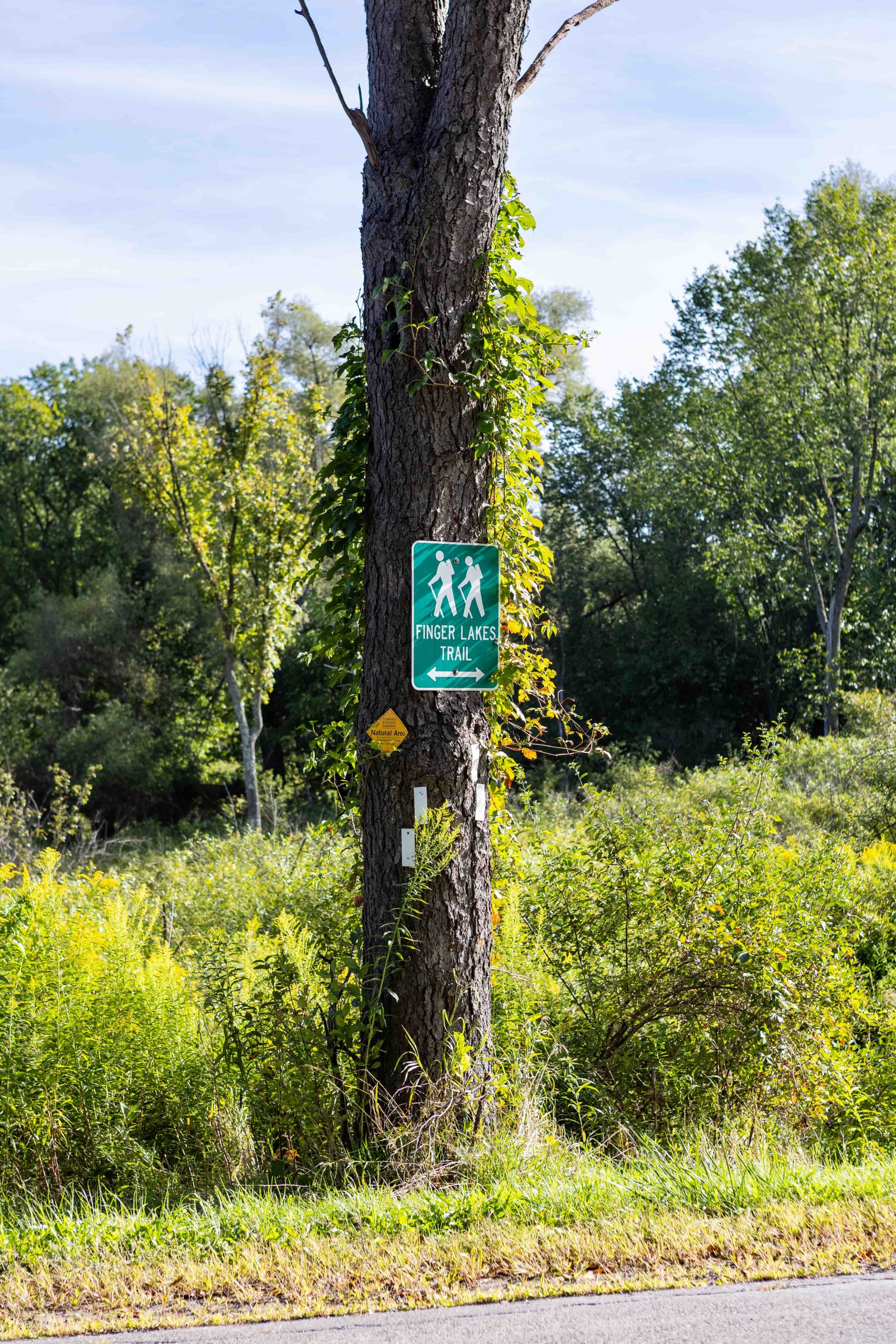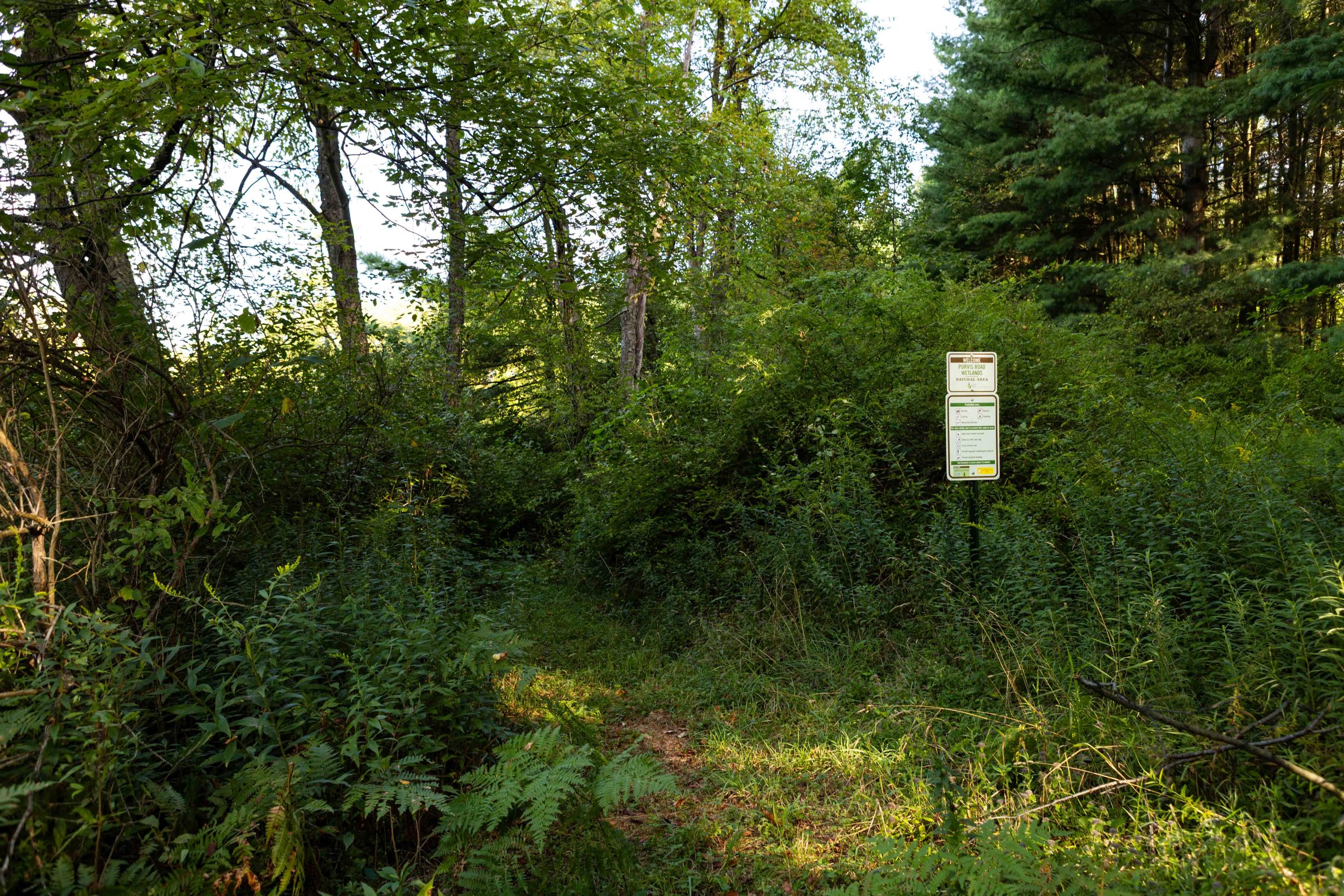 This trail provides the rare opportunity to observe a floating mat sphagnum-heath peat bog from a short boardwalk in Cornell Botanic Gardens Purvis Bog Natural Area. Please note that the wetland habitat is extremely sensitive, so visitors must remain on the boardwalk to help protect this fragile natural area. A trailhead for the multi-use Jim Schug Trail can be found nearby off East Lake Road. This scenic trail crosses through Cornell Botanic Gardens Purvis Road Wetlands Natural Area and Dryden Lake Park, following a railroad bed all the way to the Village of Dryden. The Purvis Road Wetlands Natural Area contains active beaver dams and various wetland habitats, and is an ideal site for wildlife viewing, especially birding.