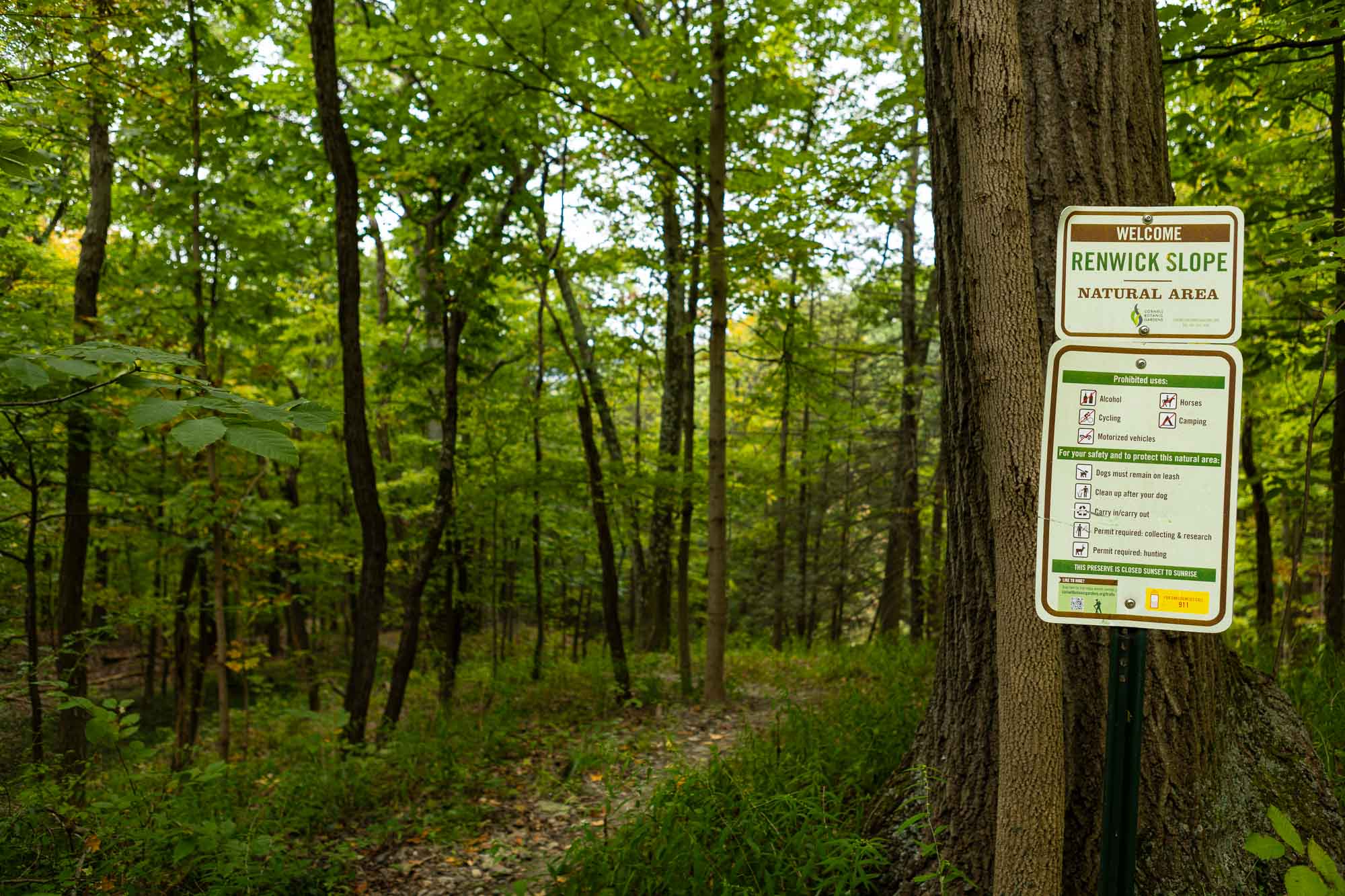 The trail within the Cornell Botanic Gardens Renwick Slope Natural Area cuts the length of this small natural area, which is a remarkably intact old-growth forest once common in the area. This natural area is found on a west-facing slope close to the shore of Cayuga Lake that connects the Cayuga Heights area to the flatlands of the City of Ithaca near Ithaca High School.
