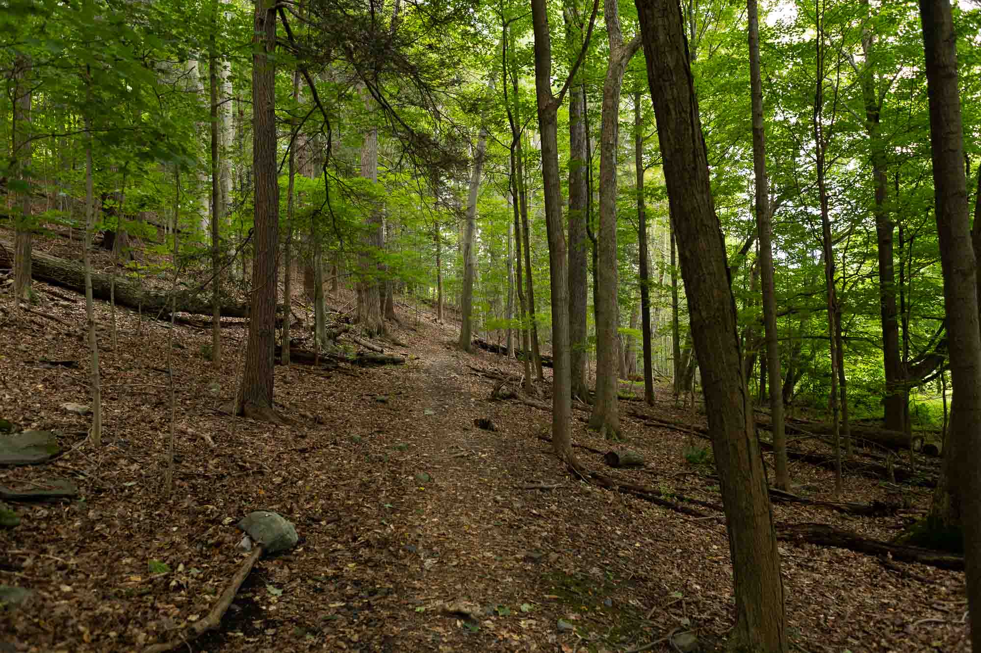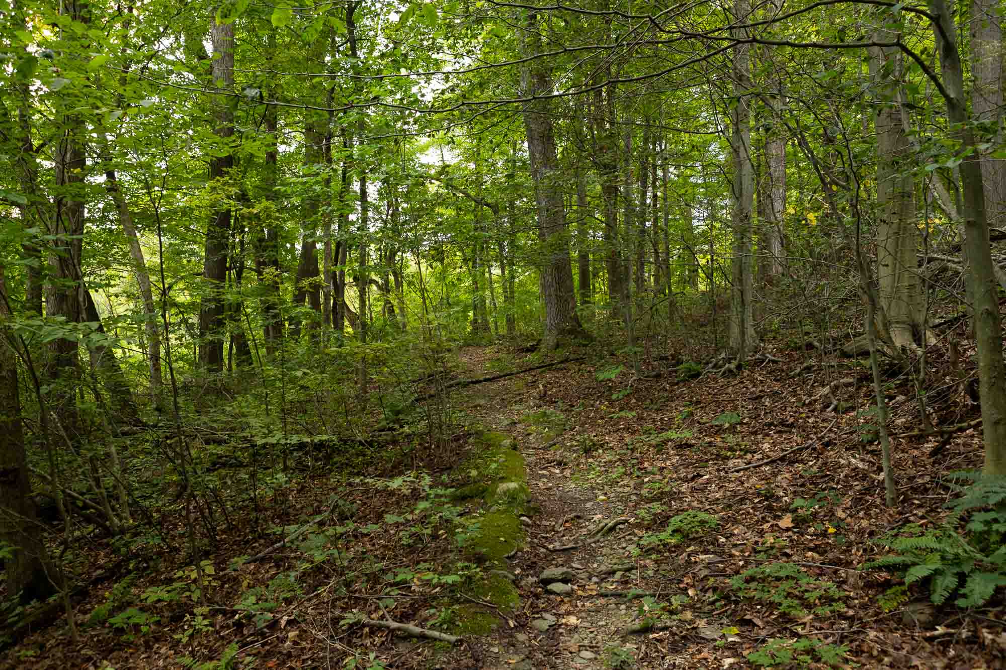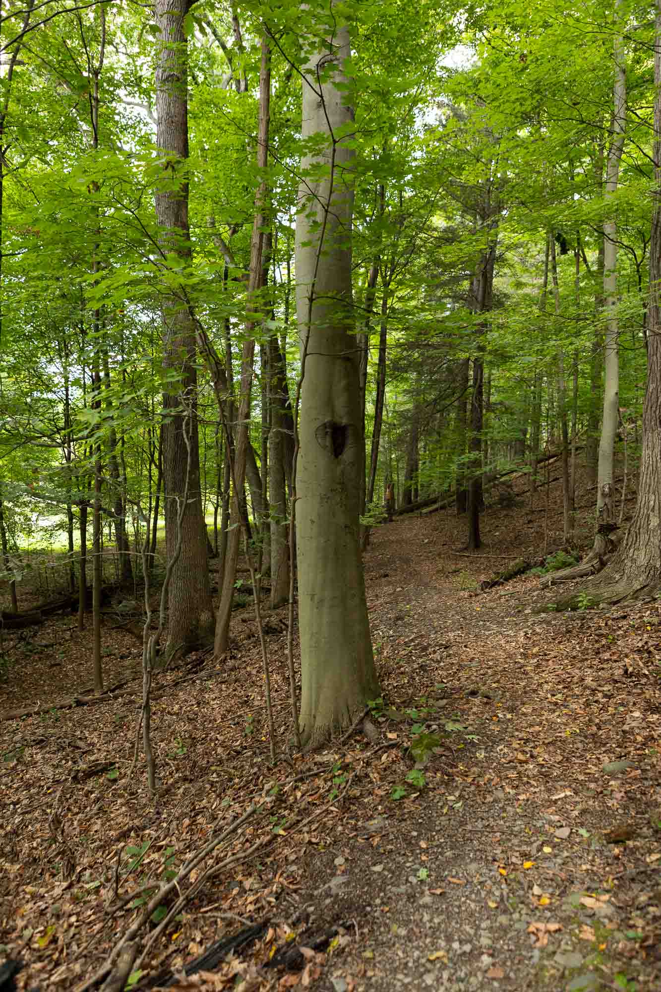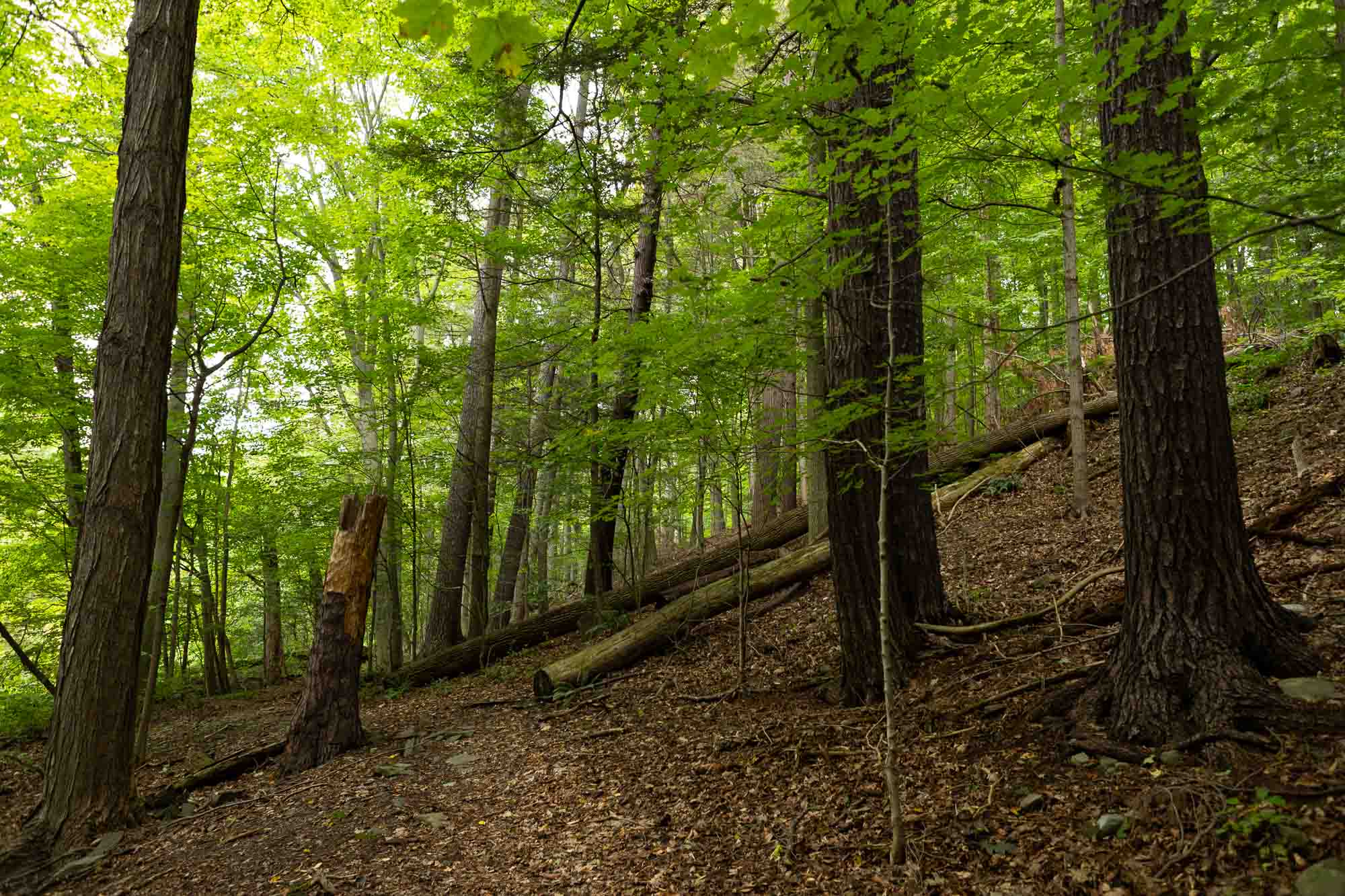Cornell Botanic Gardens Slim Jim Woods Natural Area contains one trail which cuts through this 9-acre woodland on the southwest edge of Cornell Botanic Gardens F. R. Newman Arboretum. You will find a rich diversity of trees in this beautiful old forest, including oak, hickory, maple, pine and hemlock — many of which are quite old. The eastern half of the trail is steep and ends at the high point of a slope known as Newman Meadow. There you can rest on a bench to enjoy the view or admire an old iconic oak looming overhead. The Slim Jim Woods Trail connects with many other trails within the Arboretum as well as other nearby Cornell Botanic Gardens Natural Areas via the Cayuga Trail.
